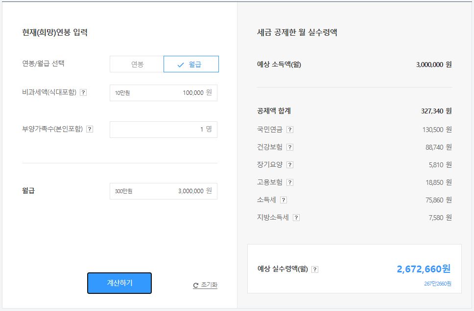 월급을 300만 원 정도 받는 직장인이라면 실수령액이 267만원 정도 됩니다. (아래 실수령액 계산기 결과 참조) 받는 급여의 1/3 정도의 금액을 저축한다면 마련할 수 있는 목돈인 것입니다. 이렇게 보면 천만원 모으기 결코 어렵지 않아 보입니다. 물론 나머지 돈 가지고 생활이 가능하냐는 또 다른 문제이긴 합니다.