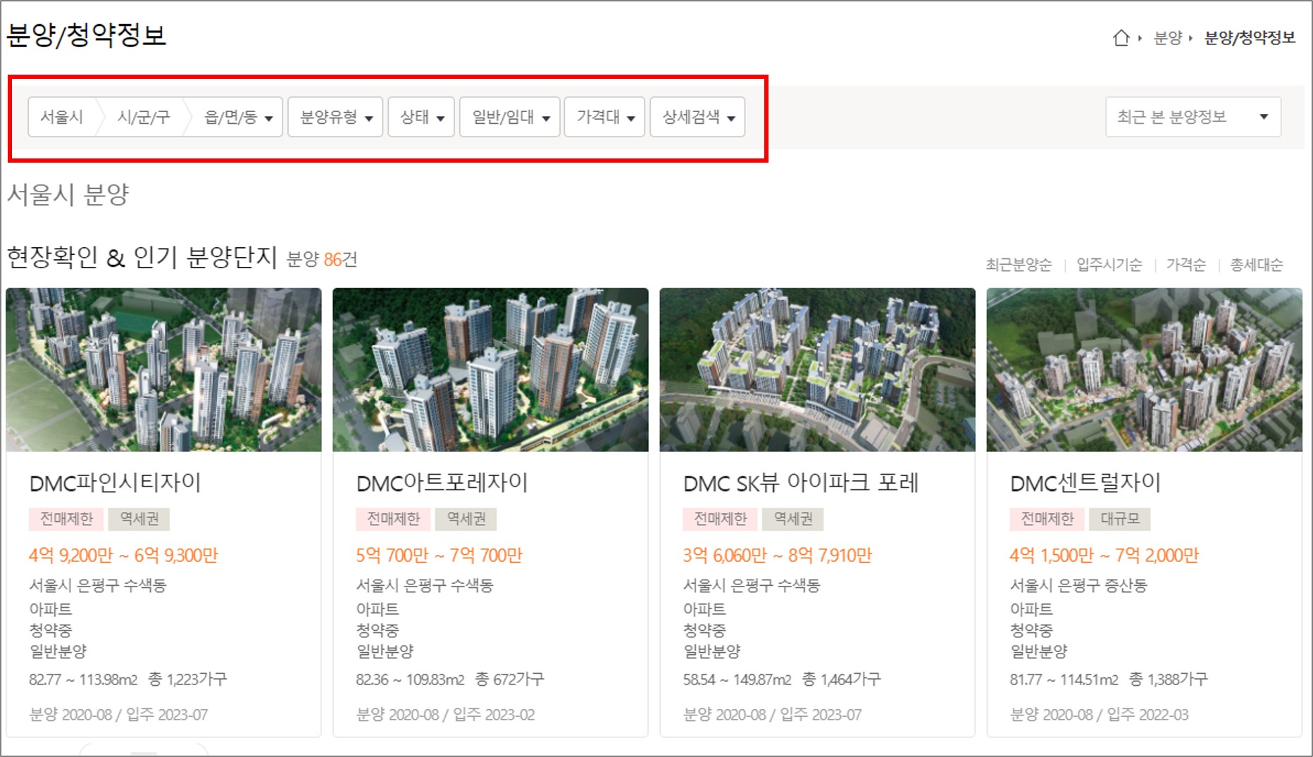 지역별 검색 뿐 아니라 분양 유형, 분양 상태, 가격대 별로도 검색이 가능합니다. 여러분들이 집을 사고 싶은 지역만 찾아볼 수 있습니다.