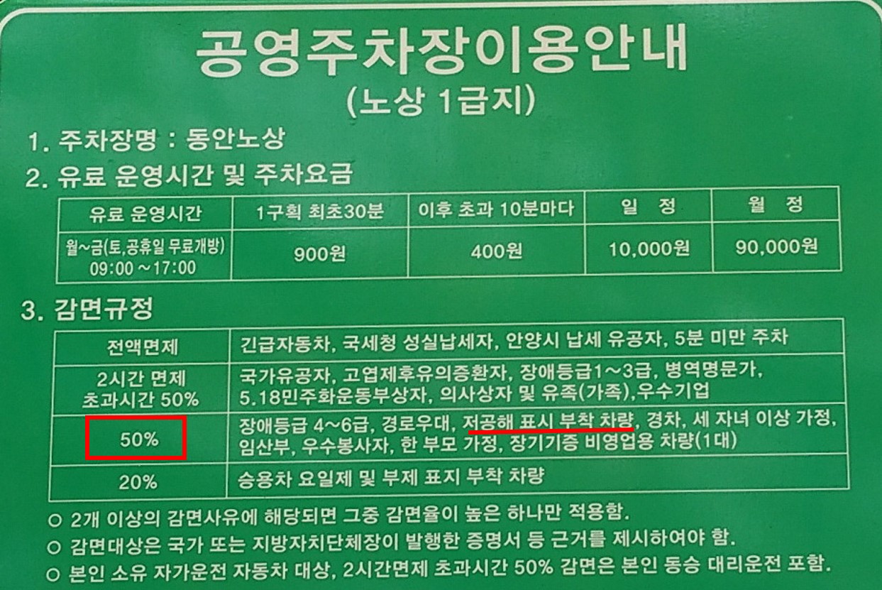 그렇게 저공해 자동차 표지발급을 받아 차량 앞 유리에 붙이면 주차요원 분들이 그걸 보고 알아서 50% 주차요금 감면을 해주시더라구요. 너무 편리했습니다.