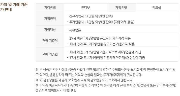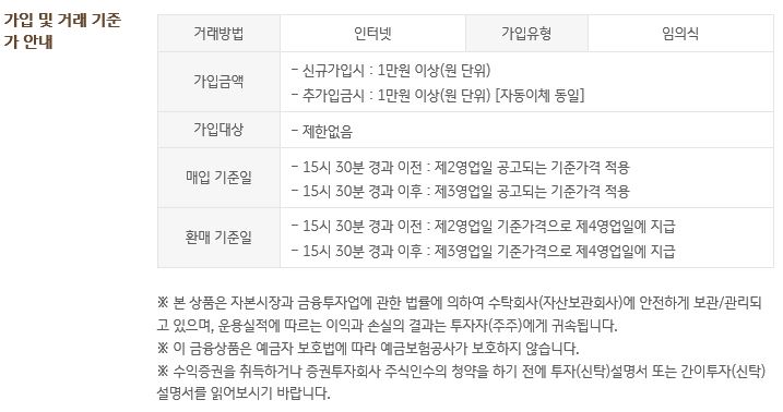 위 사진에 나와 있는 것처럼 펀드 상품에 매입, 환매 기준일에 대한 정보도 함께 알아두시면 좋을 것 같습니다.