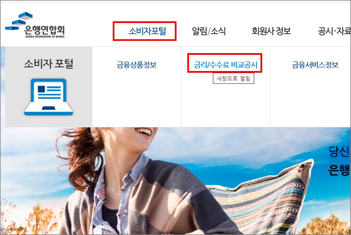 먼저 전국은행연합회 사이트(www.kfb.or.kr/main/main.php)에 접속하여 아래 그림처럼 메뉴를 '소비자 포털' - '금리/수수료 비교 공시'를 클릭합니다.