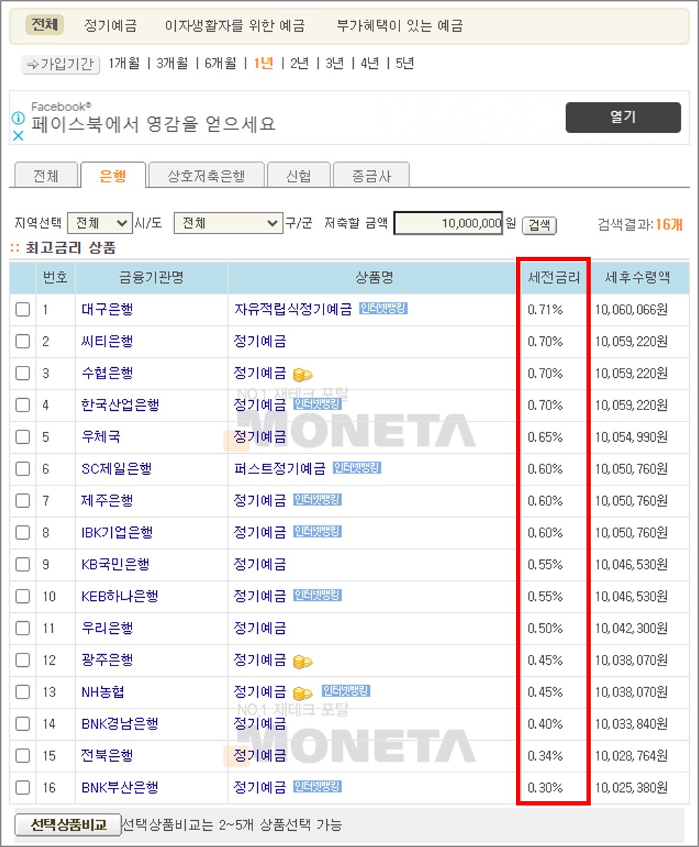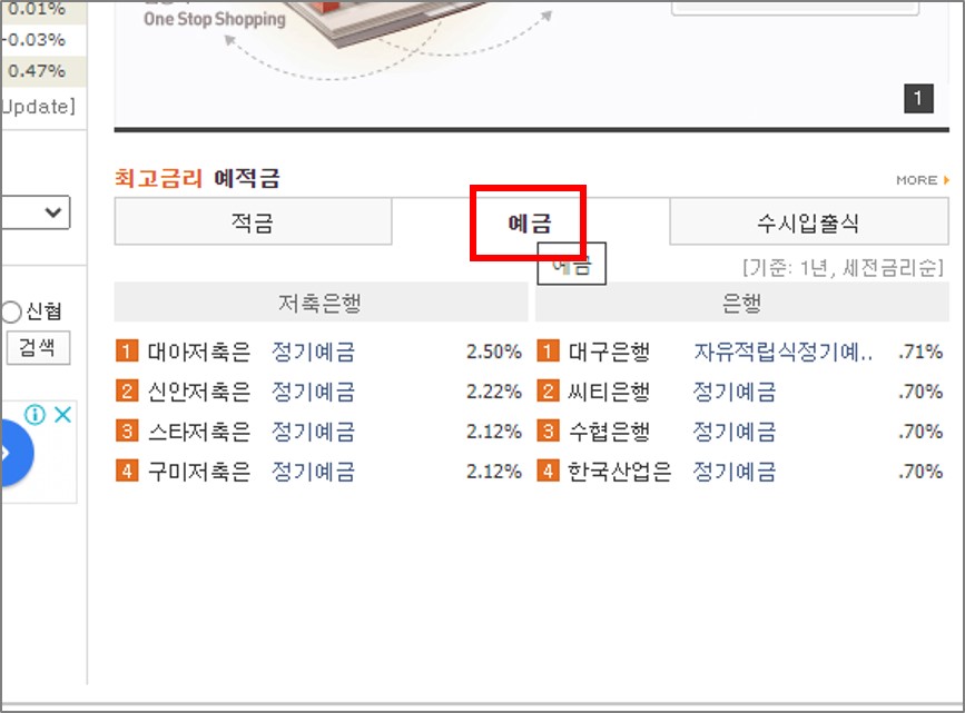 아래와 같이 은행과 예금상품, 금리를 정렬해서 볼 수 있습니다.