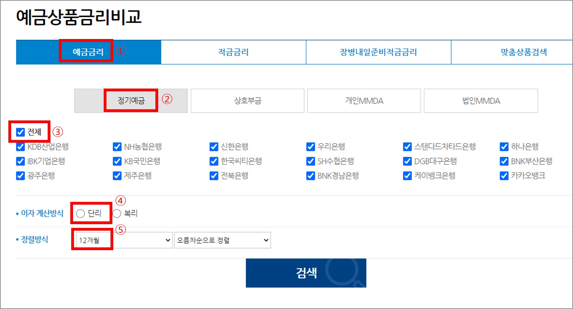 예금상품 금리비교(정기예금 금리비교)에서 ① 예금금리를 선택합니다. ② 정기예금을 선택합니다. ③ 은행종류는 '전체'를 선택합니다.(원하시는 은행만 선택하셔도 됩니다.) ④ 이자 계산 방식은 '단리'를 선택합니다.(복리 상품 거의 없습니다.) ⑤ 정렬방식은 가입 기간 및 오름차순, 내림차순을 선택하면 됩니다. 이렇게 설정한 뒤 검색을 눌러보세요.
