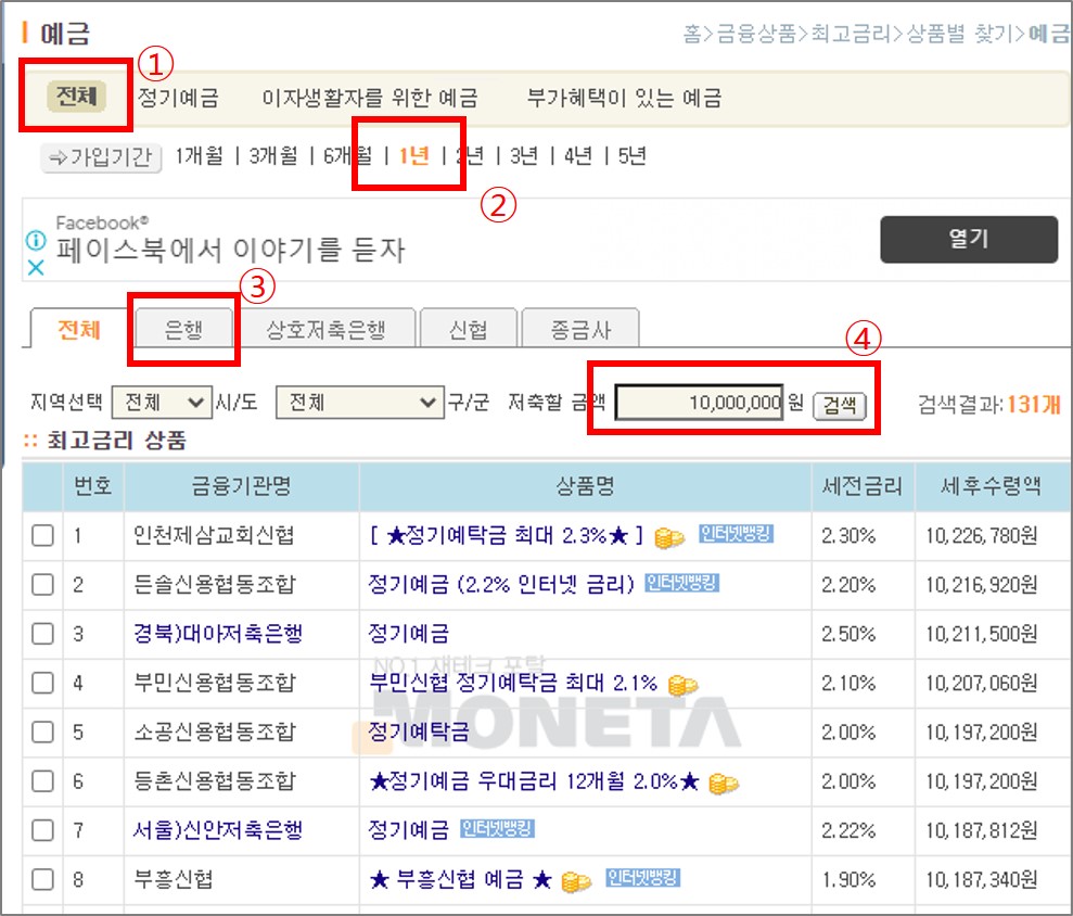 마지막이 중요합니다. 아래 그림을 보면서 읽어주세요. 맨처음 빨간 박스 순서대로 말씀드리겠습니다. ① 예금 종류를 선택하세요. 전체로 놓고 봐도 좋고 확실한 선택지가 있다면 그걸 선택해도 좋습니다. ② 다음은 가입기간을 설정합니다. 생각하신 기간을 클릭하시면 됩니다. 전 평범하게 1년치 선택해 보았습니다. ③ 다음은 은행 종류를 선택합니다. 제 1금융권 은행을 선택하시려면 '은행'을 선택하면 됩니다. 나머지 선택지는 제 2금융권입니다.(1금융권 은행 종류를 알아보시려면 다음 글을 확인해 보세요. ▶ 1금융권 은행 종류 알아보았습니다.) ④ 저축금액을 설정할 수 있습니다. 이걸 설정하면 만기시 받을 수 있는 돈이 계산이 됩니다. 특별히 결정하지 않았다면 현재 설정된 1천만원으로 놔두시기 바랍니다.