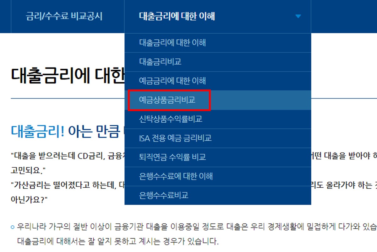 다음 세부 메뉴에서 '예금상품금리비교'를 선택합니다.