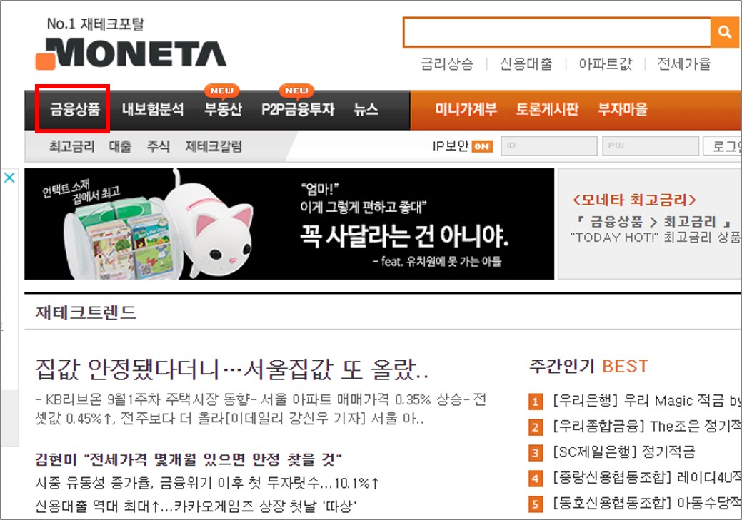 먼저, 모네타 사이트(finance.moneta.co.kr/)에 접속하면 상단 메뉴 중에 '금융상품'이라는 메뉴를 클릭하세요.