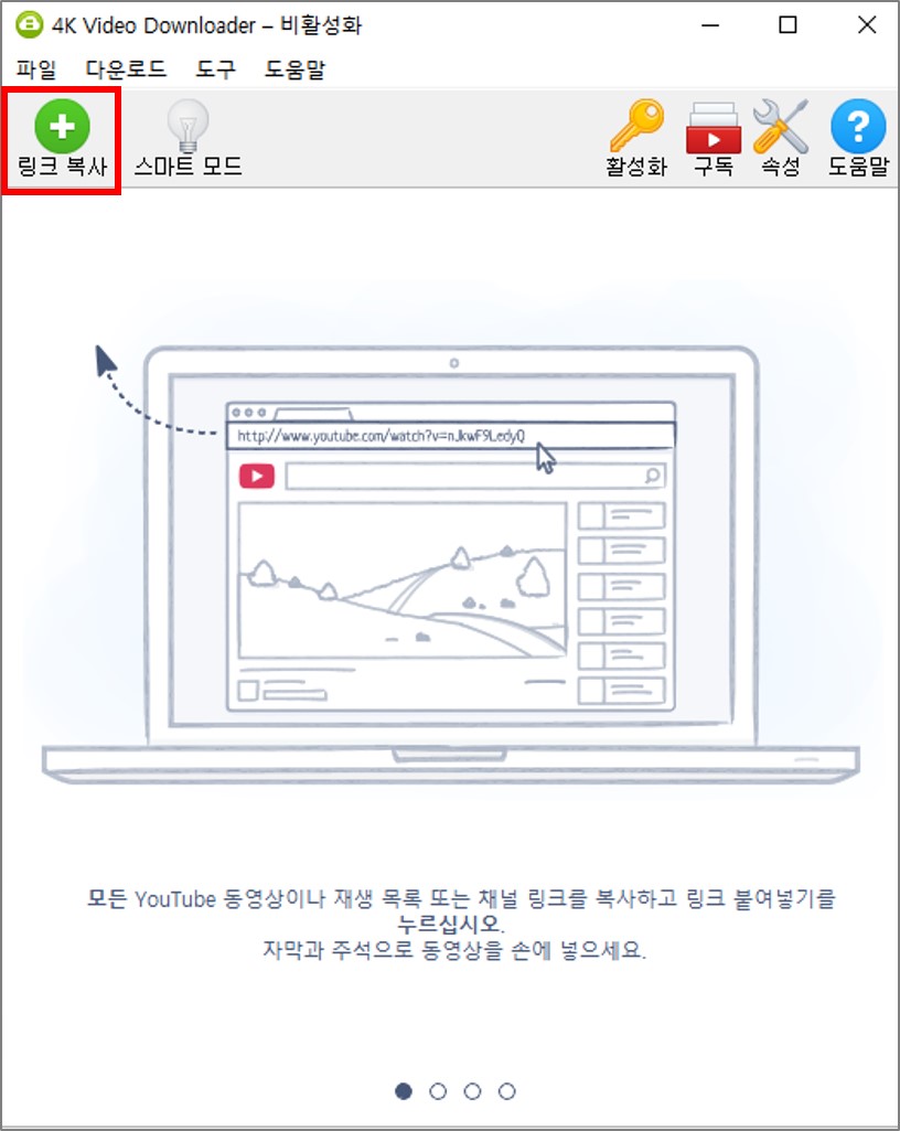 5. 4K Video Downloader에서 유튜브 동영상 다운로드하는 방법은 아래 이 프로그램에 있는 '링크 복사'에 유튜브 주소를 넣는 것이 끝입니다.