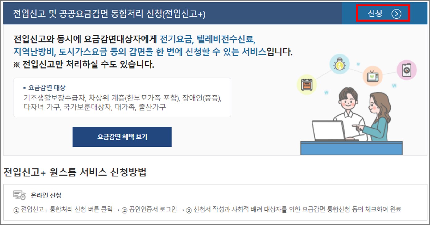 ① 전입신고+ 통합처리 신청 버튼 클릭 → ② 공인인증서 로그인 → ③ 신청서 작성과 사회적 배려 대상자를 위한 요금감면 통합신청 동의 체크하여 완료