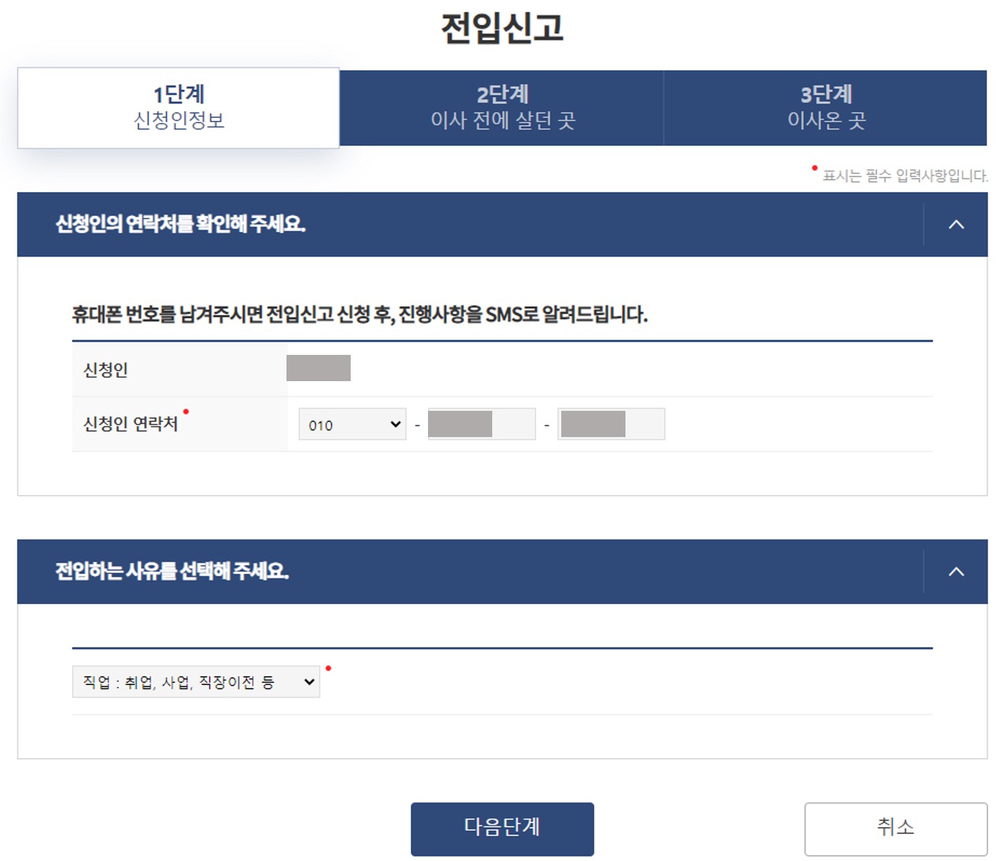 확인을 누르고 들어가면 인터넷 전입신고 신청이 시작되는데 아래와 같이 신청인정보 입력, 이사 전에 살던 곳 확인, 이사온 곳 확인 이렇게 3단계로 진행됩니다. 우선 첫번째 단계는 신청인 정보 입력인데, 간단하게 신청인 이름과 연락처, 그리고 전입 사유를 입력하고 다음 단계로 넘어가면 됩니다.