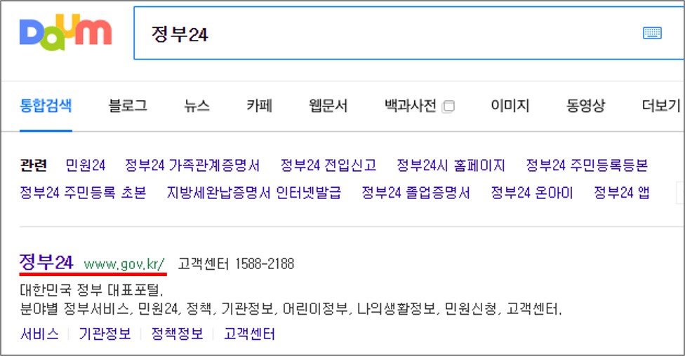 인터넷 전입신고는 아마 아시는 분들은 잘 이용하고 계시는 각종 민원업무 사이트인 정부24에서 실시하고 있습니다. 다음 또는 네이버 검색창에서 정부24를 검색하여 홈페이지로 접속합니다. 바로가기 링크를 통해 여기서 바로 정부24 홈페이지로 이동할 수 있습니다. (정부24 홈페이지 바로가기: https://www.gov.kr/portal/main)