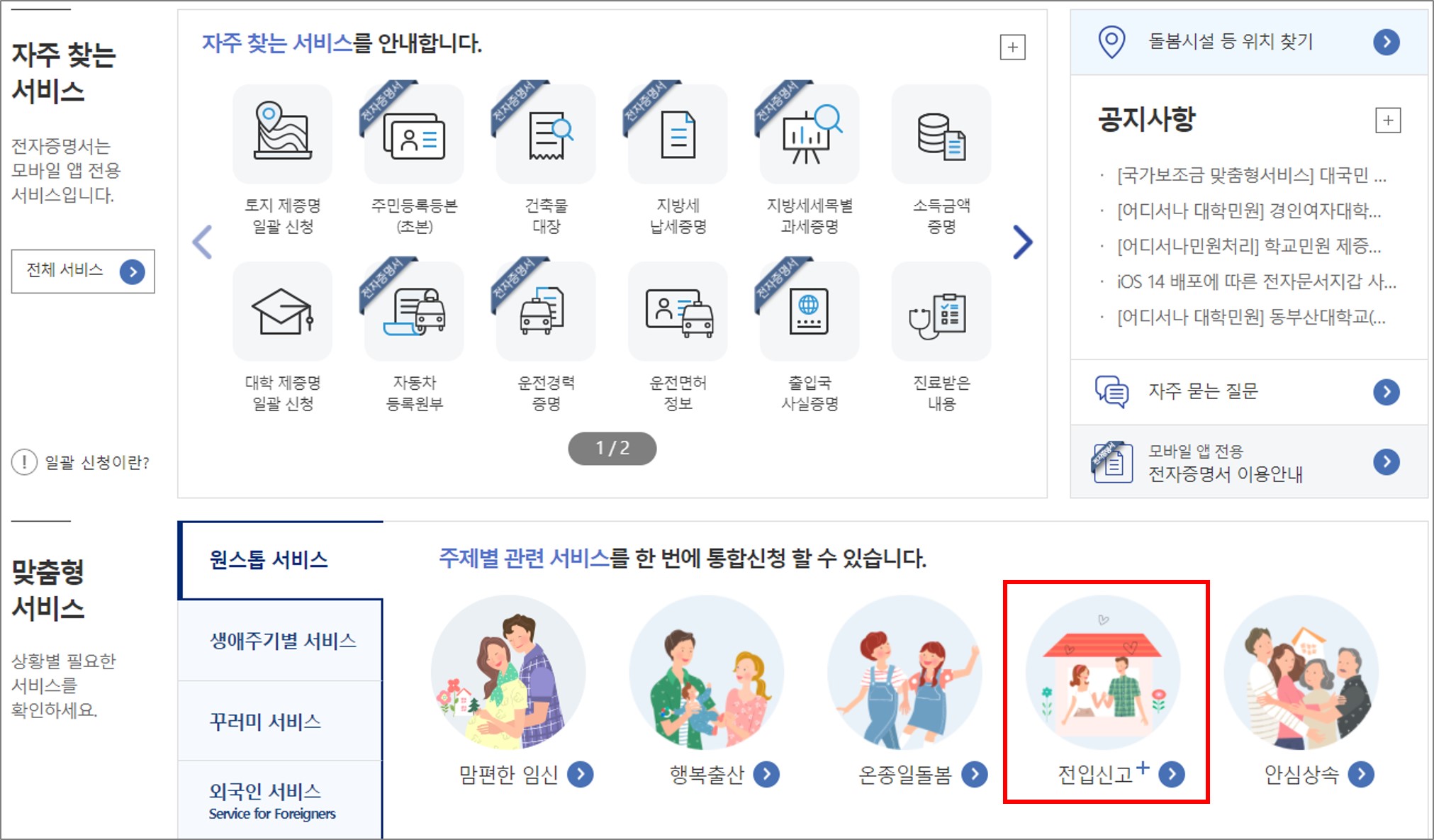 정부24 사이트에 들어가셔서 메인 화면 중간쯤 보면 '맞춤형 서비스'라는 곳이 있습니다. 맞춤형 서비스에서 '원스톱 서비스'를 선택하신 후 세부 메뉴를 보시면 '전입신고' 메뉴를 보실 수 있으십니다. 아래 이미지처럼 위치하고 있습니다. 아래 이미지에 빨간 박스에 '전입신고' 버튼이 있는데 이처럼 생긴 것을 찾으시면 됩니다.