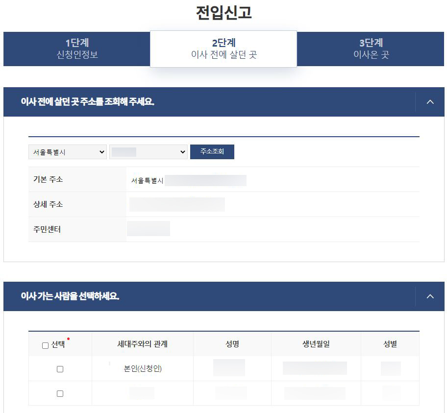 다음은 인터넷 전입신고 방법 2단계로 이사 오기 전에 살던 곳을 조회해야 합니다. 아래와 같이 이전 살던 곳의 동까지만 입력하면 이사 전에 살던 곳의 주소를 찾아서 확인할 수 있습니다. 그리고 맨 아래를 보면 이전 집에서 살던 사람들 중 어떤 사람이 이사를 가게 되는지 선택하면 됩니다. 가족 전체가 이사가면 전체 다 체크하고 다음단계로 넘어가세요.