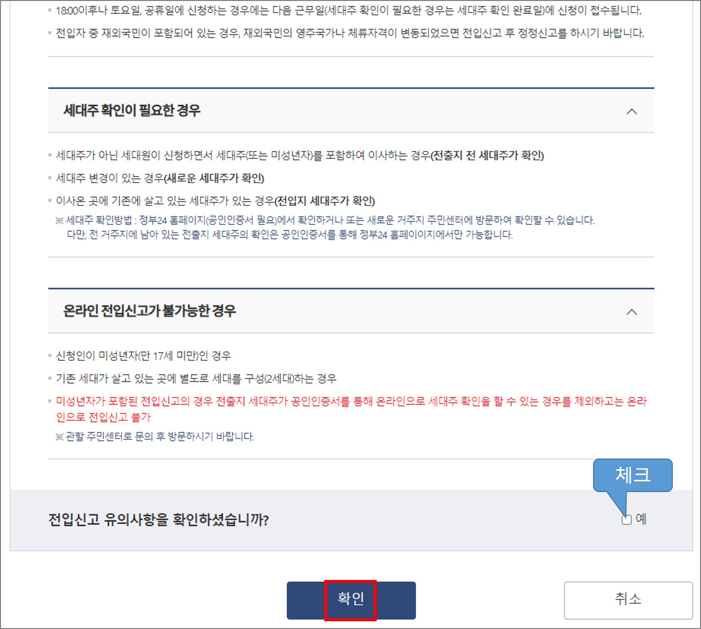 공인인증서 로그인을 하고 나면 우리가 원하는 전입신고 신청을 본격적으로 시작할 수 있습니다. 공인인증서 로그인을 하면 아래와 같이 유의사항 확인여부를 체크하게 됩니다. 내용한번 읽어보시고 '예'에 체크 후 확인을 누릅니다.
