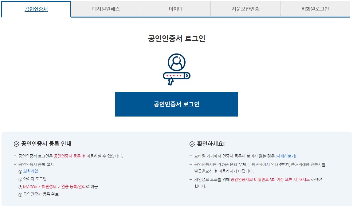 해당 화면에서 전입신고 및 공공요금감면 통합처리 신청(전입신고+) 신청을 클릭해서 신청 작업을 진행하면 되는데 앞서 말씀드린 것처럼 공인인증서 로그인이 필요합니다. 비회원 신청도 가능하지만 정부24 사이트는 아주 자주 이용하는 행정서비스 제공 사이트이니 이 기회에 공인인증서 등록을 해보시는 것도 좋습니다. 저는 공인인증서 로그인을 선택하겠습니다.