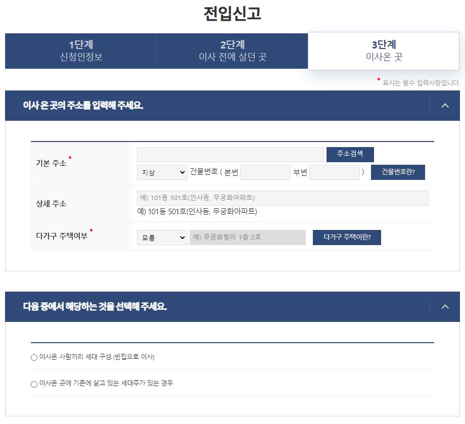 마지막 3단계는 현재 전입해 온 곳 주소를 입력하는 단계입니다. 2단계와 마찬가지로 주소검색을 통해 기본 주소, 상세 주소를 입력하고 다가구 주택여부를 확인합니다. 모르면 모른다고 하면 됩니다. 아파트는 다세대주택에 해당합니다. 아파트로 이사하시는 것이라면 다가구에 해당되지 않습니다. 마지막으로 이사가는 곳이 비어있는 집으로 이사인지 다른 지역 세대주와 함께 살게 된 것인지 선택합니다.