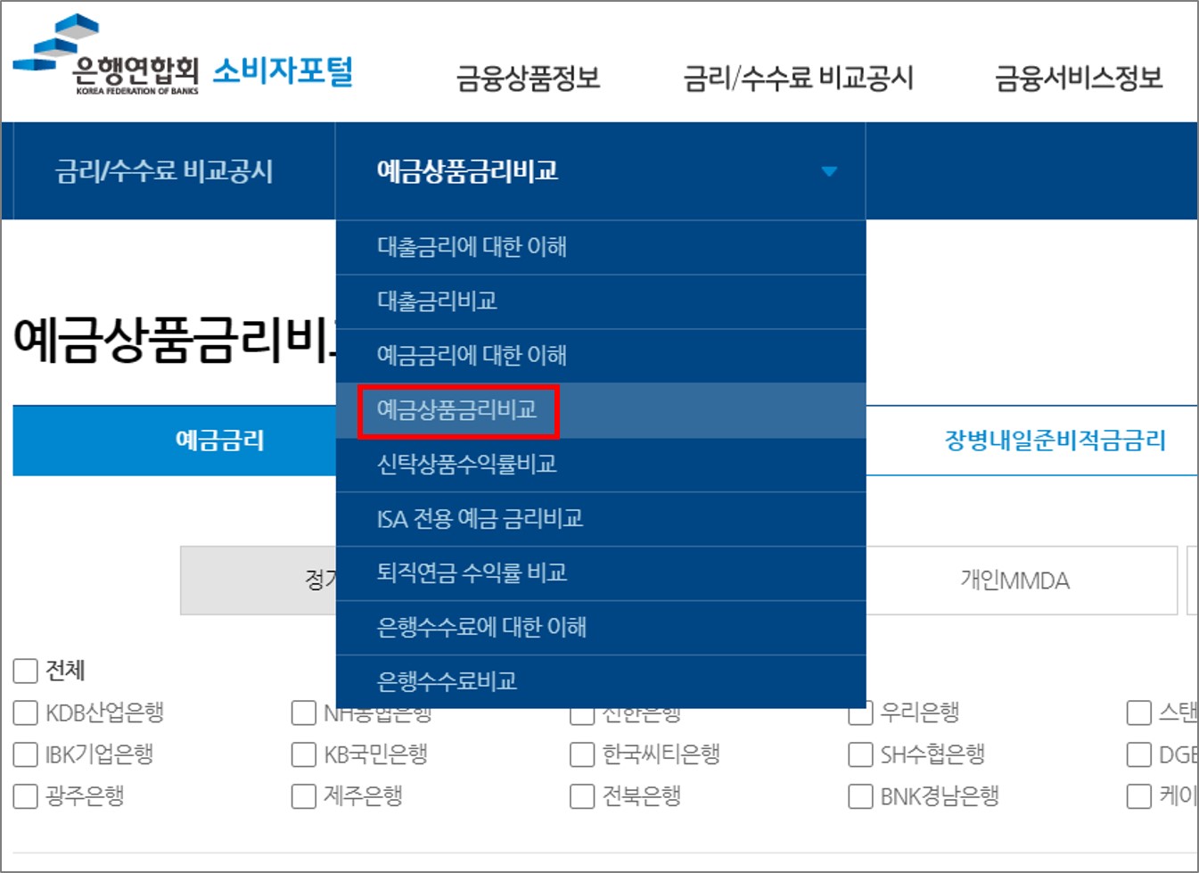 다음 아래 이미지를 참고하여 예금상품 금리비교 메뉴를 클릭합니다.