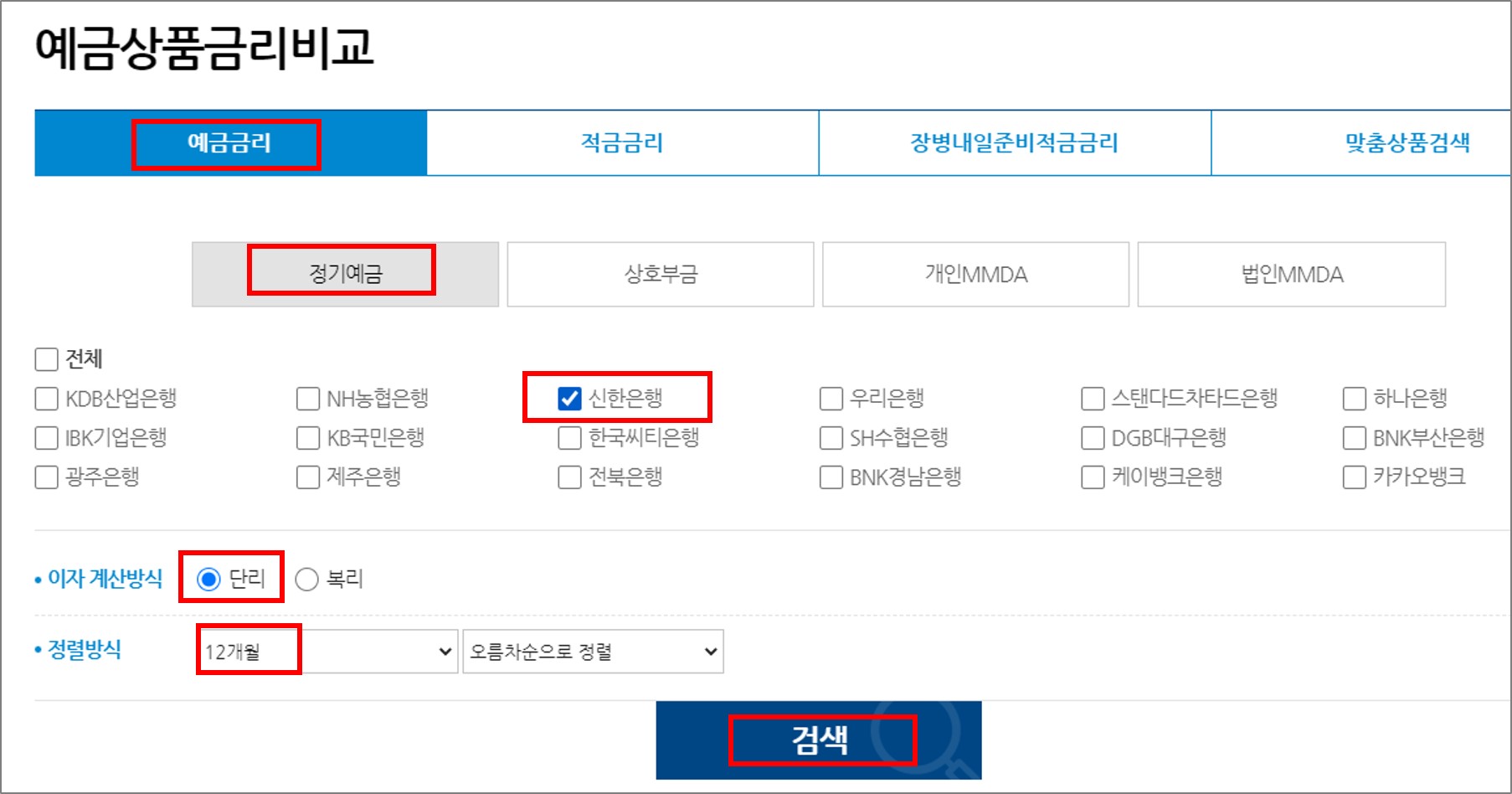 다음 차례대로 예금금리, 정기예금, 신한은행, 단리, 12개월을 체크하고 검색을 누릅니다.